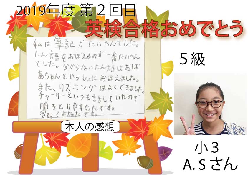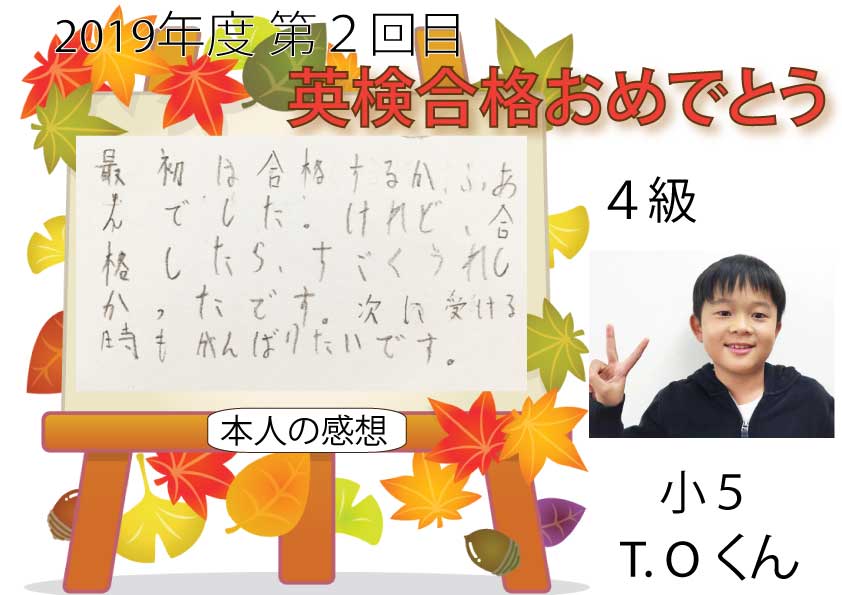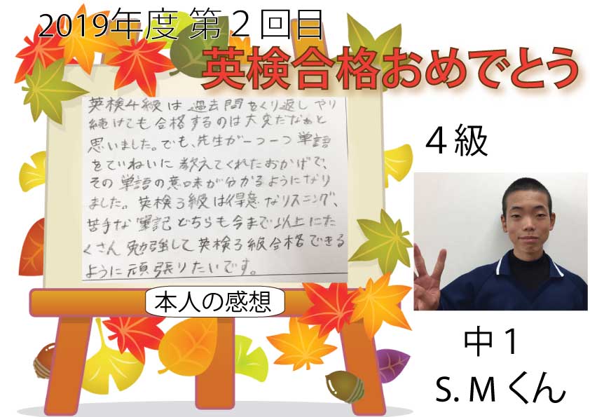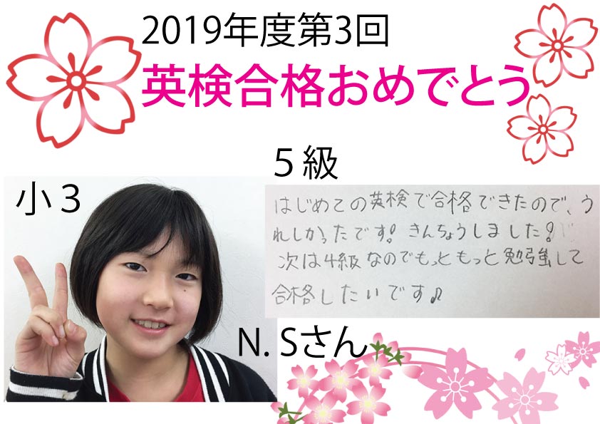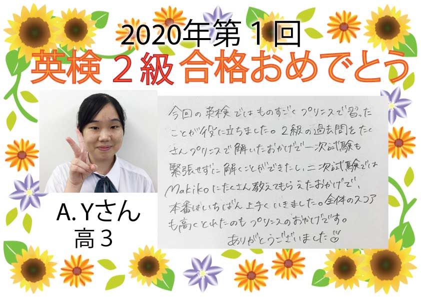 2019年度第3回 英検合格者をご紹介します。 英検前は追加講習を受講したり、2次面接前にも追加で面接練習をしたり、合格までの道のりは遠かったかもしれませんが、みなさん本当に頑張りました。本当におめでとうご ...