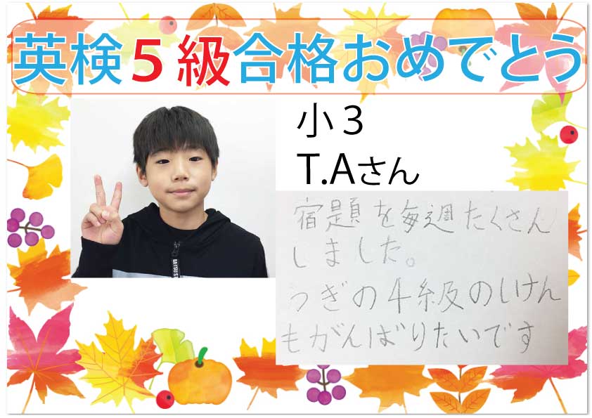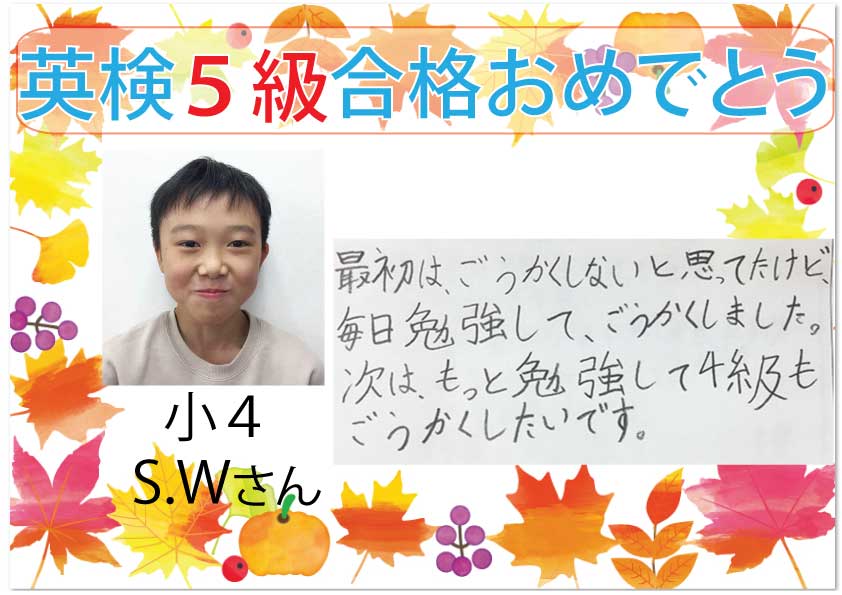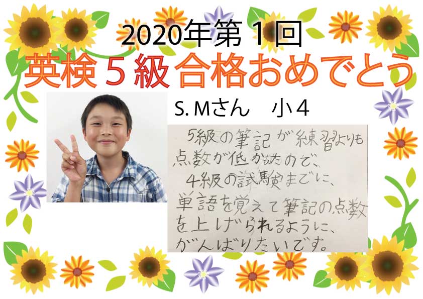 合格者からの喜びの感想を紹介します。今年はコロナ禍での受検となり、大変だったと思います。また、5級は初めての受検となるので、緊張したと思います。たくさんの生徒たちが合格できました🎊次の目標を掲げて、ま ...