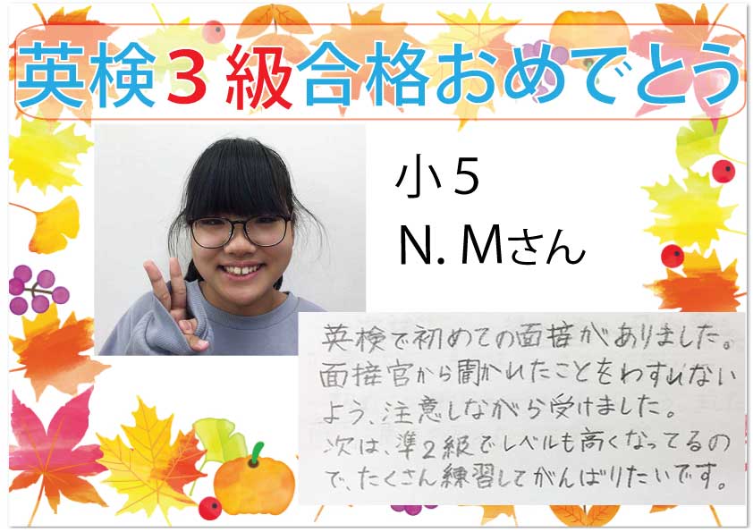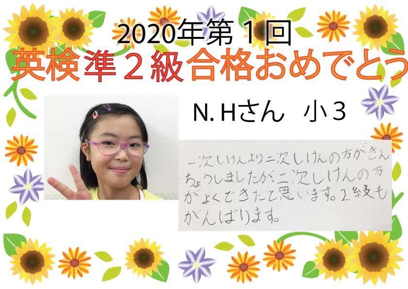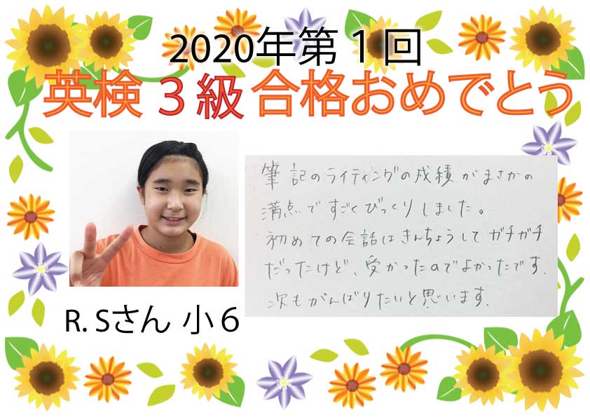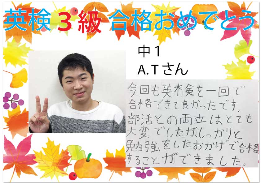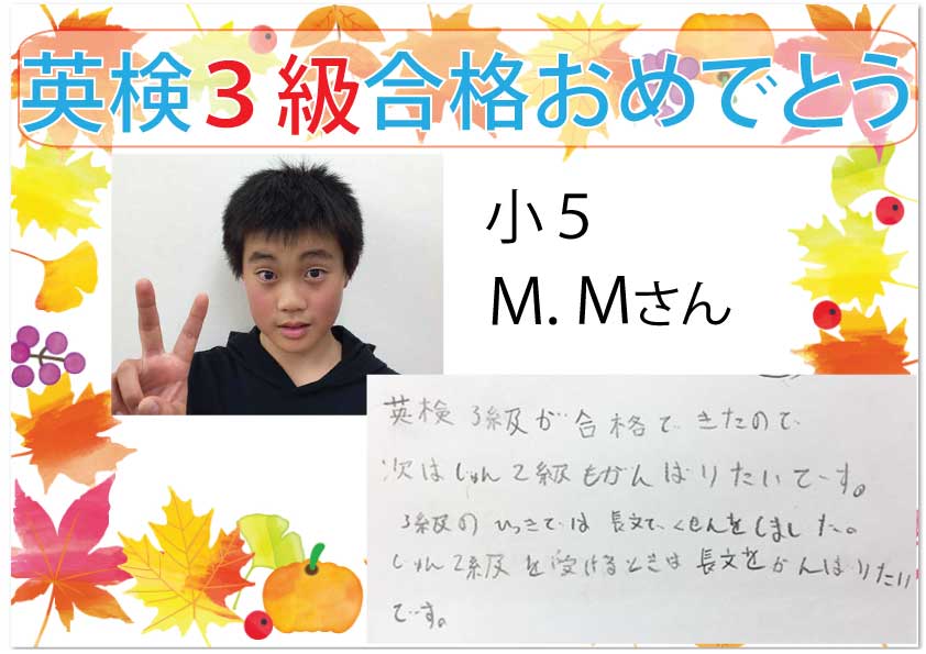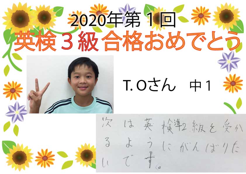 3級合格者からの喜びの声をご紹介します。今年はコロナ禍の中、大変だったと思いますが、みんなで逆境を乗り越えての合格です。次の目標を掲げて、また勉強を頑張りたい!と意欲が伝わります。次の英検まであと1か月 ...