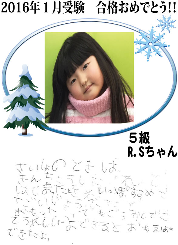 1月に英検初受験、園児さんのR.Sちゃん、見事5級に合格しました。