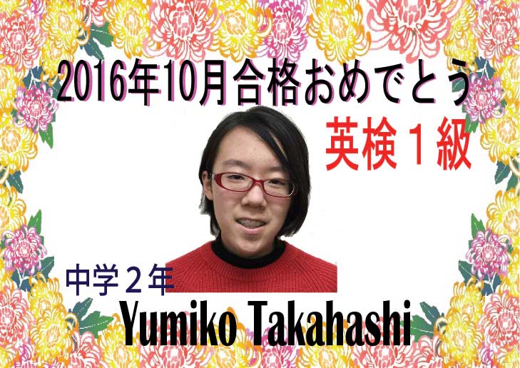 2016年第2回 英検合格者をご紹介します(^^♪中学2年生の Yumiko Takahashi さんが英検1級に合格しました!!おめでとうございます✨✨中学生の1級合格者がプリンスから誕生しました(^◇^)第3回1月に受験を控えている皆さんも、後に続いて合格できるようにがんばりましょう!!