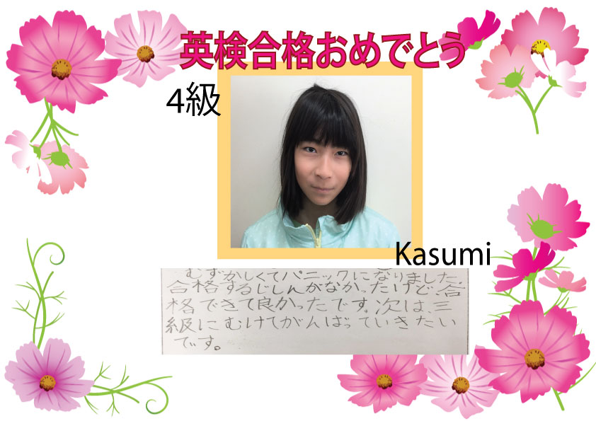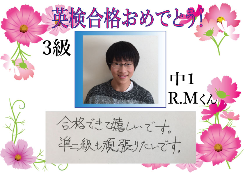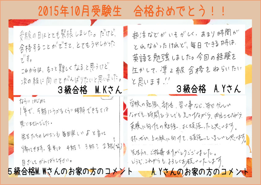 ~~2015年第3回 英検合格者の声をお届けします~~1月に英検受験のK.Mくん、4級に合格しました。本人とお家の方の合格喜びの声です。 次回は6月です。6月を目指すみんなも続いて合格できるように、がんば ...