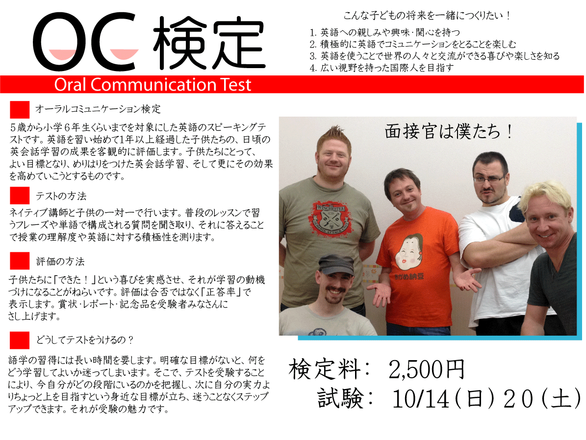 プリンス初のスピーキングテスト、いよいよお申し込みが始まります。英検や児童英検では計りきれないコミュニケーション能力を、面接形のテストで計ります。受験者には賞状、レポートそして記念品を差し上げます。 ...