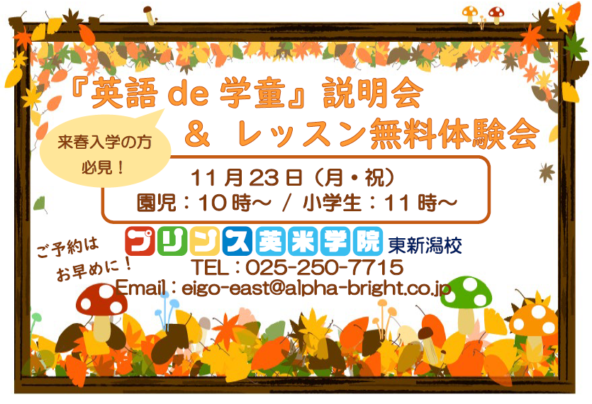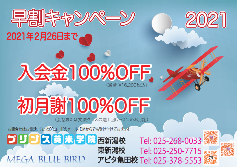 プリンス英米学院 西新潟校・東新潟校では、早割キャンペーンを実施中! 「春から英語を始めてみたい…」と考えている方!年度初めからの通塾開始でも、今月中にご入会いただければキャンペーン特典を適用し ...