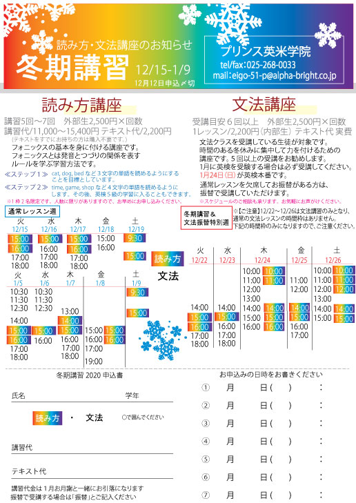 プリンス英米学院 東新潟校です。 12月14日(月)は、振替レッスン専用日のため、通常より時間を短縮して営業いたします。皆様にはご迷惑をお掛けいたしますが、何卒ご理解のほどよろしくお願いいたします。 営業時間 ...