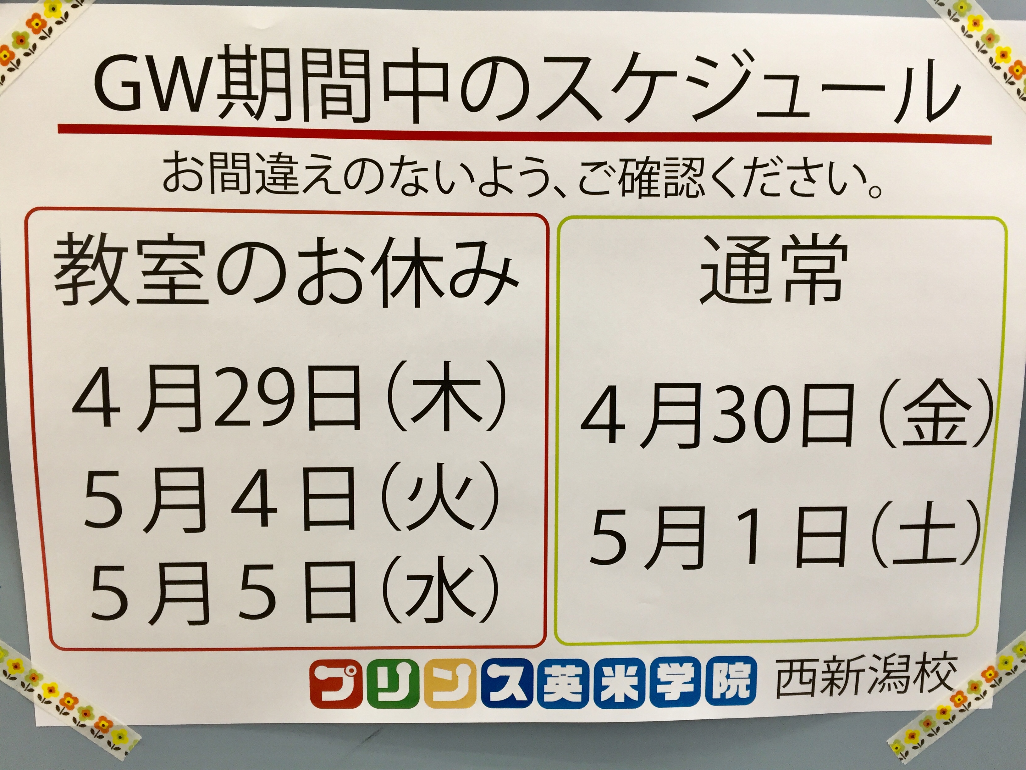 プリンス英米学院 東新潟校では、下記の期間は休業とさせていただきます。 12月26日(土) ~ 1月3日(日) ご用の方は、メールまたは留守番電話にてお問い合わせください。(お返事は1月4日以降になります旨、何卒ご了 ...