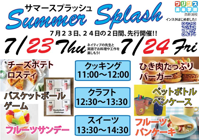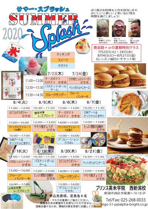 サマースプラッシュ7月23日&7月24日の2日間先行開催します!!スケジュール詳細は画像をご覧ください。お申込み&お問合せは、プリンス英米学院西新潟校まで、お電話、メールにて受付いたします。プリンス英 ...