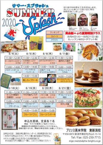 ~~サマースプラッシュ2020開催決定!~~@プリンス英米学院西新潟校今年はクッキング&クラフトに加えてスイーツづくりの新しいクラスも登場!!今年は夏休みがいつもより短いですが、その分、3種類の特別レッス ...