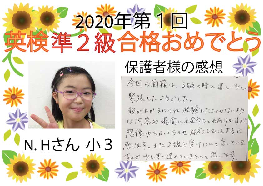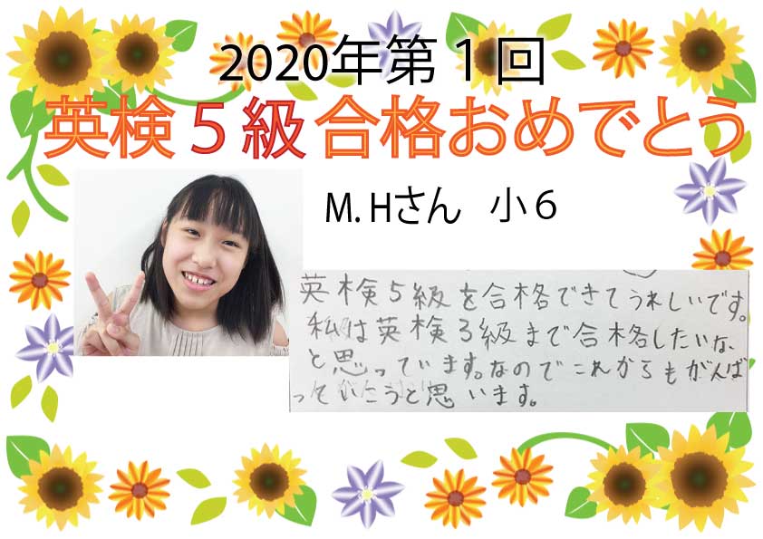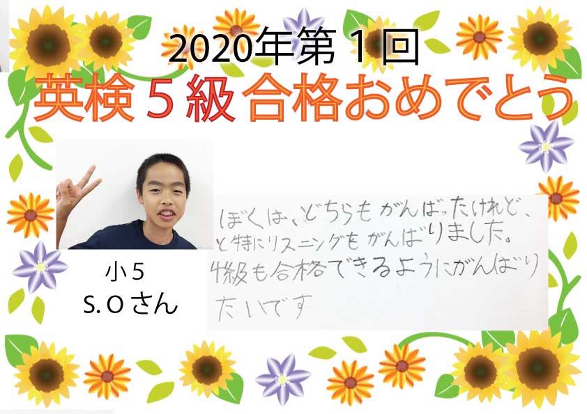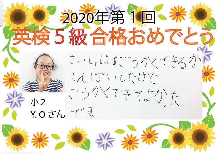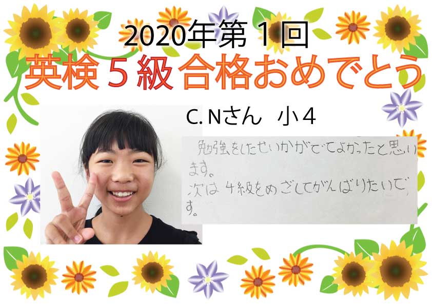 2020年度第1回 英検合格おめでとう!!~Part1~今回は5月31日実施の英検が延びて7月受験となりました。5級は初めての受検となるので、緊張したと思います。たくさんの生徒たちが合格できました次の英検まであと1か ...