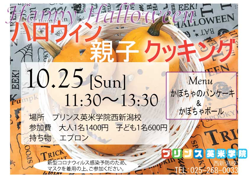 ハロウィン親子クッキング開催します!!10月25日 日曜日 11:30~13:30メニュー:かぼちゃのパンケーキ&かぼちゃボール参加費:大人1名1400円、こども1名600円場所:プリンス英米学院西新潟校親子あわせて ...