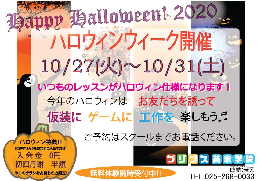 西新潟校でハロウィンウィークを開催します。10/27火曜日~10/31土曜日の1週間は毎年恒例のハロウィンウィークを開催します。仮装をしてゲームをして工作をしてTrick оr Treatでお菓子をもらおう!お友 ...
