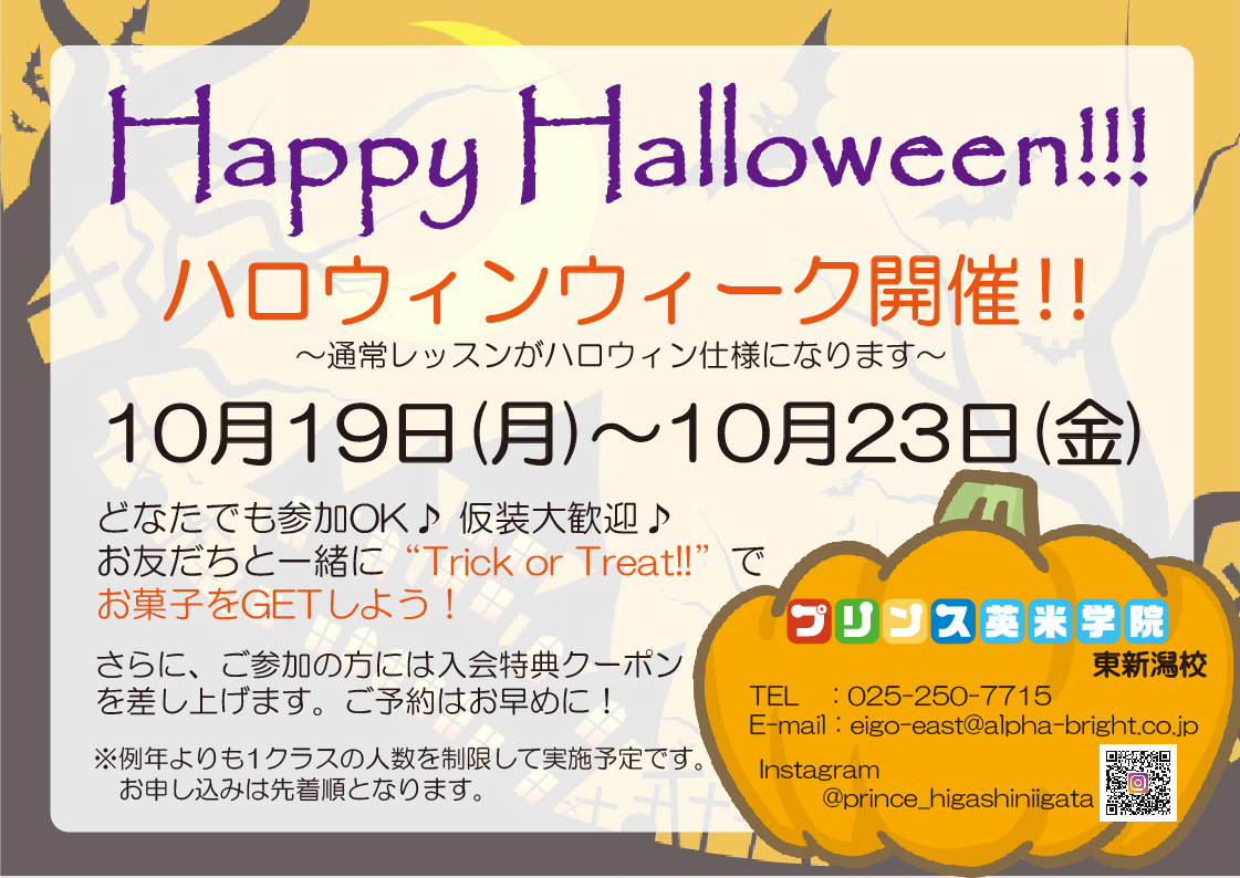 すっかり寒くなってきた新潟市内ですね☔そしてあっという間に10月に入って一週間が過ぎてしまいました。 10月のイベントと言えば…そう!ハロウィンです!!!東新潟校では、今年もハロウィンウィークを開催 ...