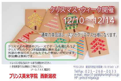 プリンス英米学院西新潟校では12月10日(火)~12月14日(火)の1週間、クリスマスウィークを開催します。この1週間はいつものレッスンが、クリスマスバージョンになり、クリスマス工作とクリスマスゲームをします。この ...