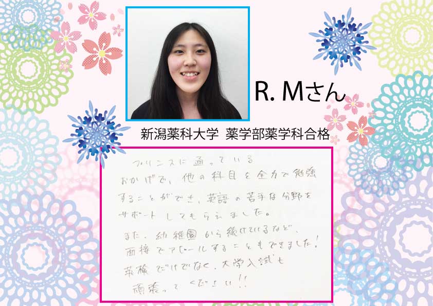 サクラサク合格おめでとう一足早く桜が咲きました。園児さんから英語を続けている高校3年生、晴れて大学合格となりました。おめでとうございます!将来の夢に向かってがんばってくださいね。応援しています! ...