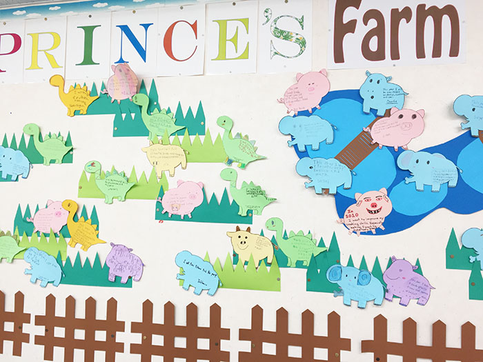 今年の目標を英語で書いています英検に合格したい!もっと長く泳げるようになりたい!家族と海外旅行したい、ピアノとバレエを上達したい、宿題をがんばる!などなど。壁の動物たちが増えてきました。来週にはプリン ...