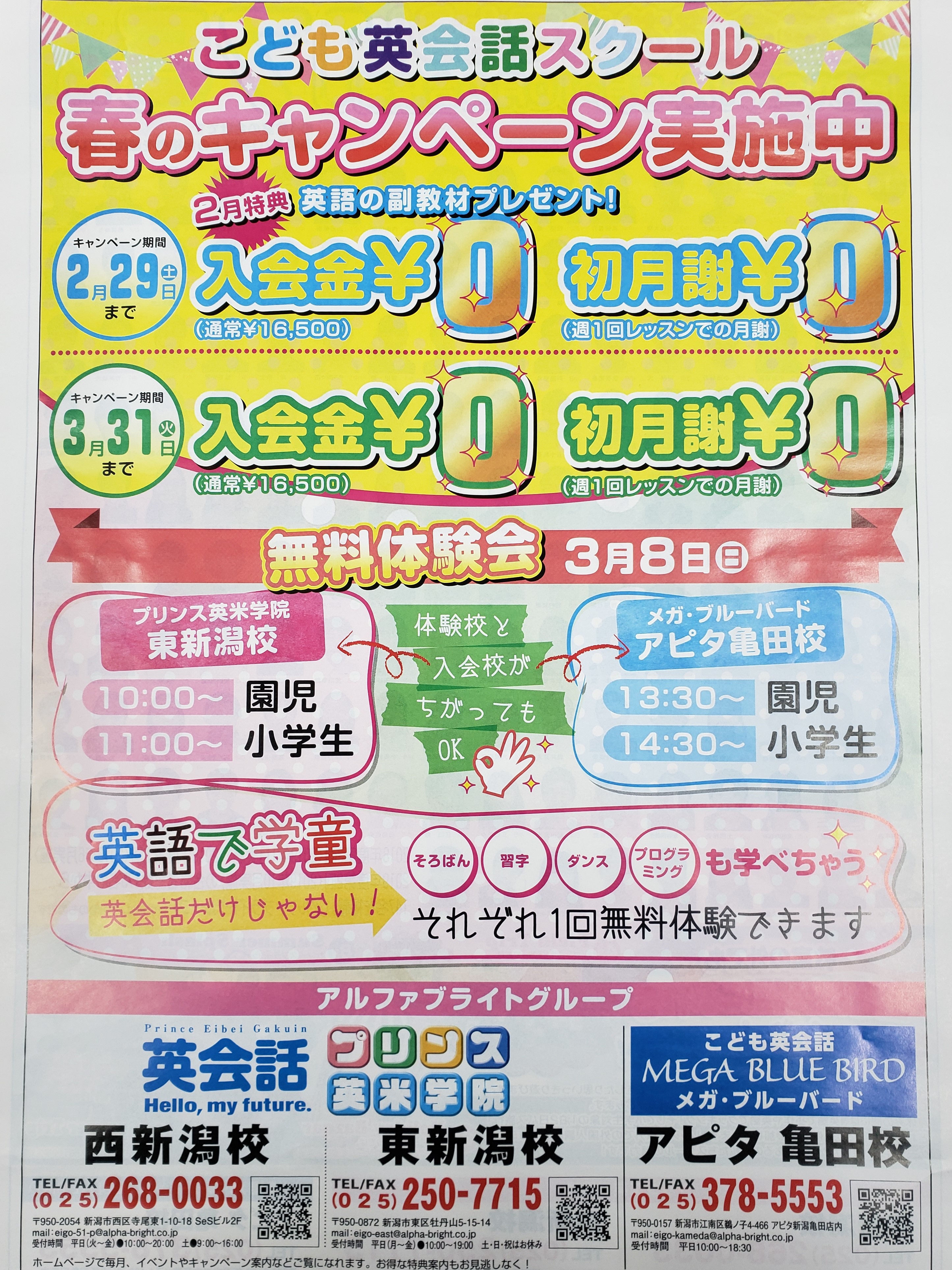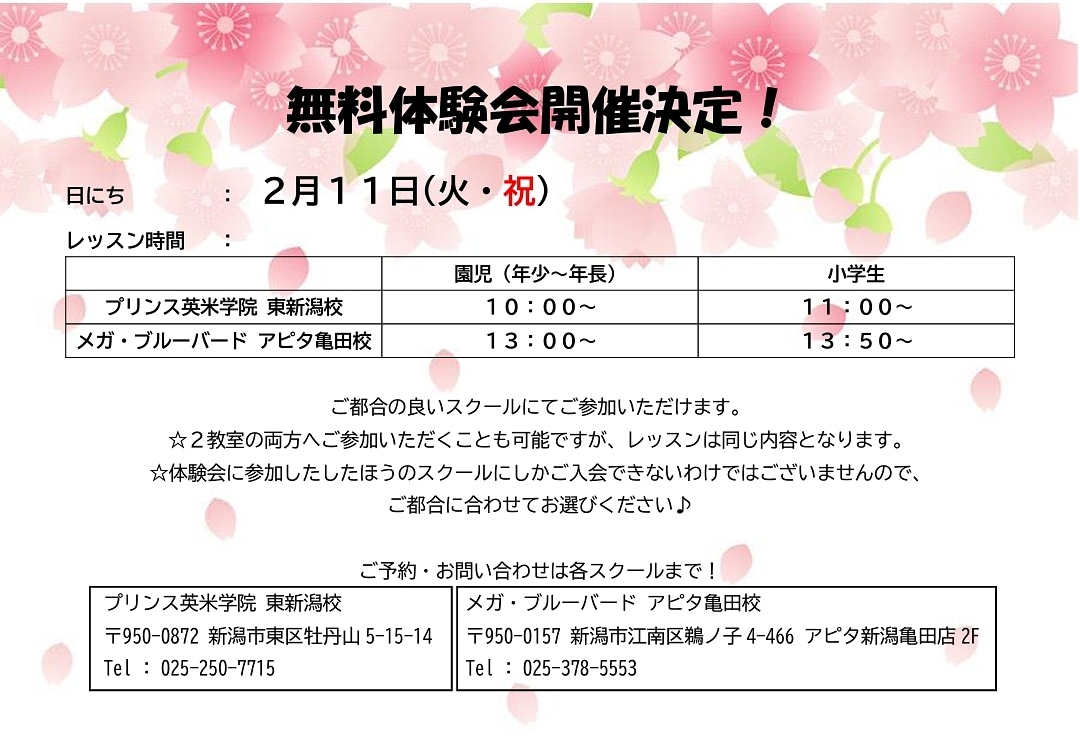 東新潟校では、2月に英会話レッスンの無料体験会を実施することなりました!園児~小学生のどなたでもご参加いただけますので、ぜひお気軽にお越しください♪日にち : 2月11日(火・祝)時間 : 添付画像をご ...