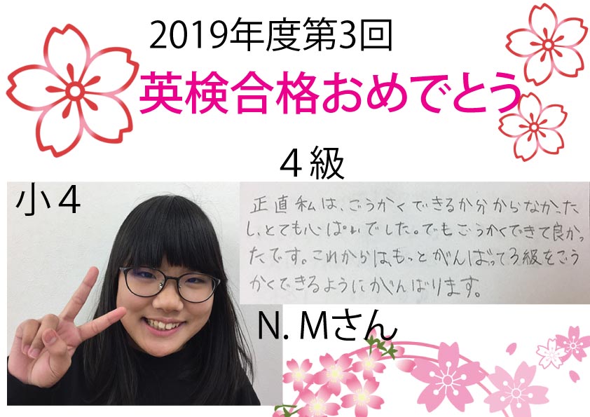 2019年度第3回 英検合格者と感想をご紹介します。英検後、英語が好きになった、復習が楽しい!と言っている生徒もいます。どんどん英語を好きになって、色々な事にチャレンジをしてほしいです。次回は5月31日日曜日 ...