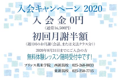 夏の入会キャンペーンスタート入会特典入会金無料初月謝半額無料体験レッスンも随時受付しております。ご予約・お問合せはプリンス英米学院西新潟校025-268-0033eigo-51-p@alpha-bright.co.jphttp://prince.alpha-br ...