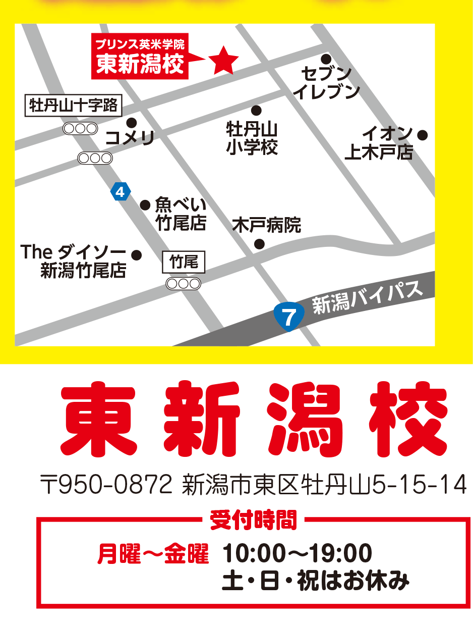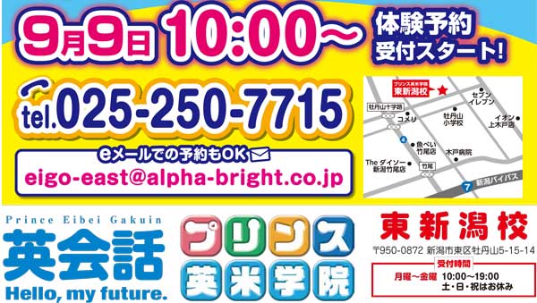 お問合せ先、掲載しました!~プリンス英米学院☆東新潟校オープンします!~9月9日(月)10:00~ 体験予約受付スタート!お電話&メールにて受付いたします。=========================ご予約・お問合せ先はコチラ ...