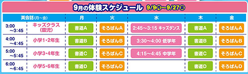 9月9日(月)10:00~ 体験予約受付スタート!!9月は体験レッスン開催月となります。期間: 9月9日(月)~9月27日(金)英会話・そろばん・書道・ダンスの中からそれぞれ1回ずつ無料体験ができます。※9月中に無 ...