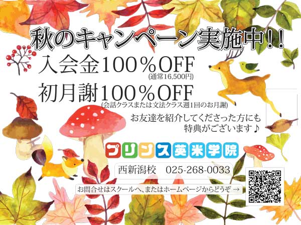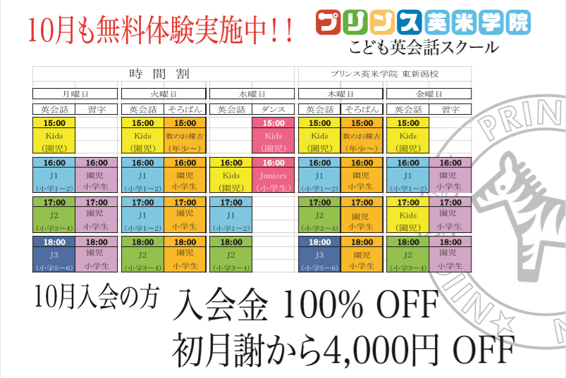 プリンス英米学院東新潟校では、10月も引き続き無料体験レッスンを受付中です!英会話レッスンはもちろん、そろばん、書道、ダンスのレッスンもそれぞれ1回ずつ無料で体験できます。興味のある習い事だけでもぜひ体 ...