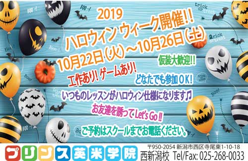 今年もプリンス西新潟校にハロウィンウィークがやって来る10月22日火曜日から10月26日土曜日の1週間外国人講師と日本人講師が毎日仮装でお出迎えみんな仮装でレッスンを楽しもう!ハロウィンゲームを楽しも ...