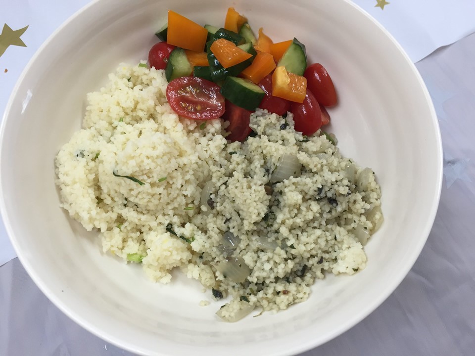今月のメニューは クスクスサラダです。クスクス(couscous)は北アフリカ発祥で、主にモロッコや中東、今はヨーロッパなどで広く食べられている、小麦粉で作られた「世界最小のパスタ」と言われています。みなさん珍 ...
