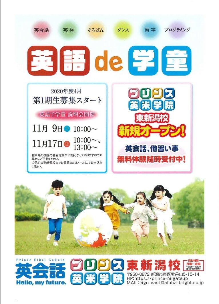 プリンス東新潟校では、『英語de学童』の説明会を実施いたします!来春小学校へご入学予定の方はもちろん、今後ご検討予定の方や、すでに学童へ通われている方、ご興味だけお有りの方など...お子様の年令問わず、お ...