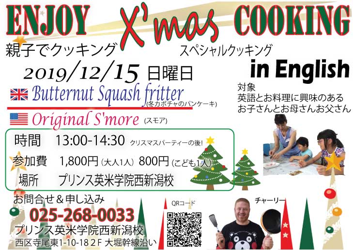 クリスマススペシャル~Merry Christmas~12月15日 日曜日 13:00~14:30クリスマス親子クッキングを開催します!メニュー お料理&デザートButternut Squash Fritter (冬かぼちゃのパンケーキ)Original S'm ...