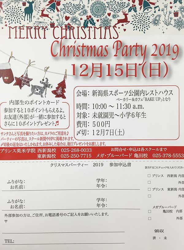 クリスマスパーティー開催します日時12月15日(日曜日)10:00~11:30参加対象:未就園児さん~小学6年生会場:新潟県スポーツ公園内レストハウス参加費:500円(前払い・当日払も可能)申込締切: ...