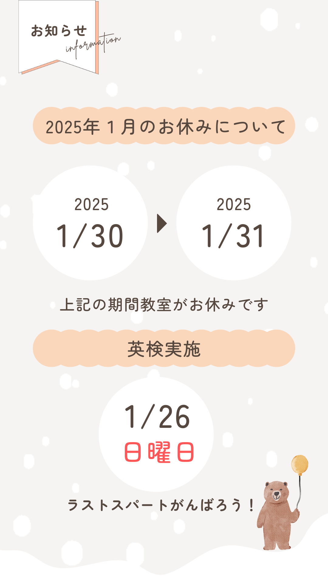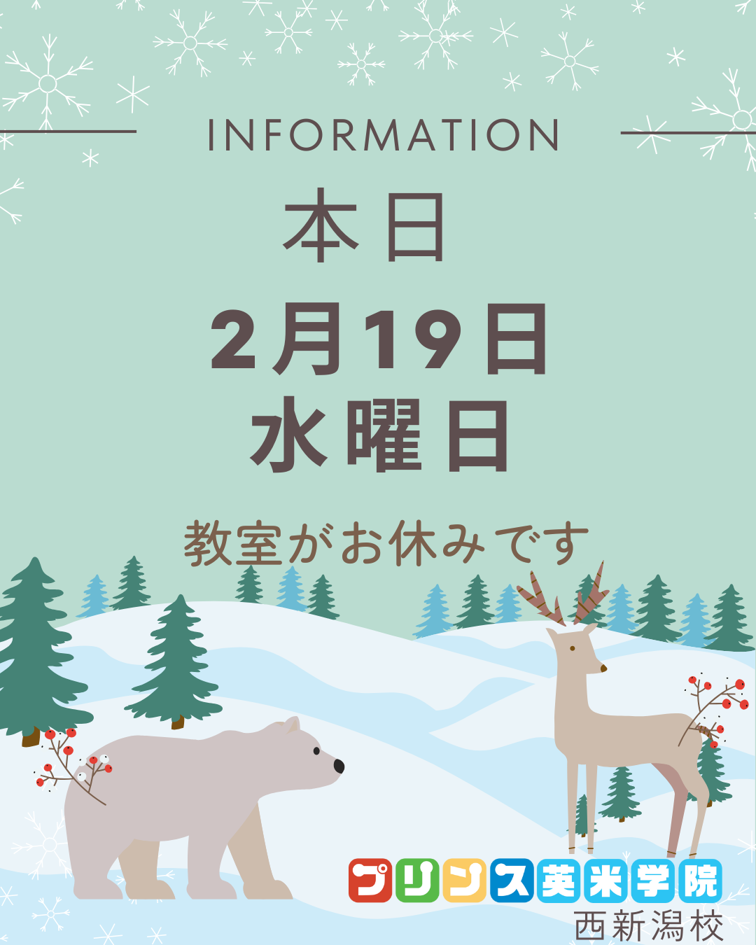 ◆1月のお休み (西新潟校)1月30日(木)、31日(金) ◆2024年度第3回英検実施 いよいよですね、体調を万全にがんばろう!1月25日(土)東新潟校1月26日(日)西新潟校 いよいよですね、体調を万全にがん ...
