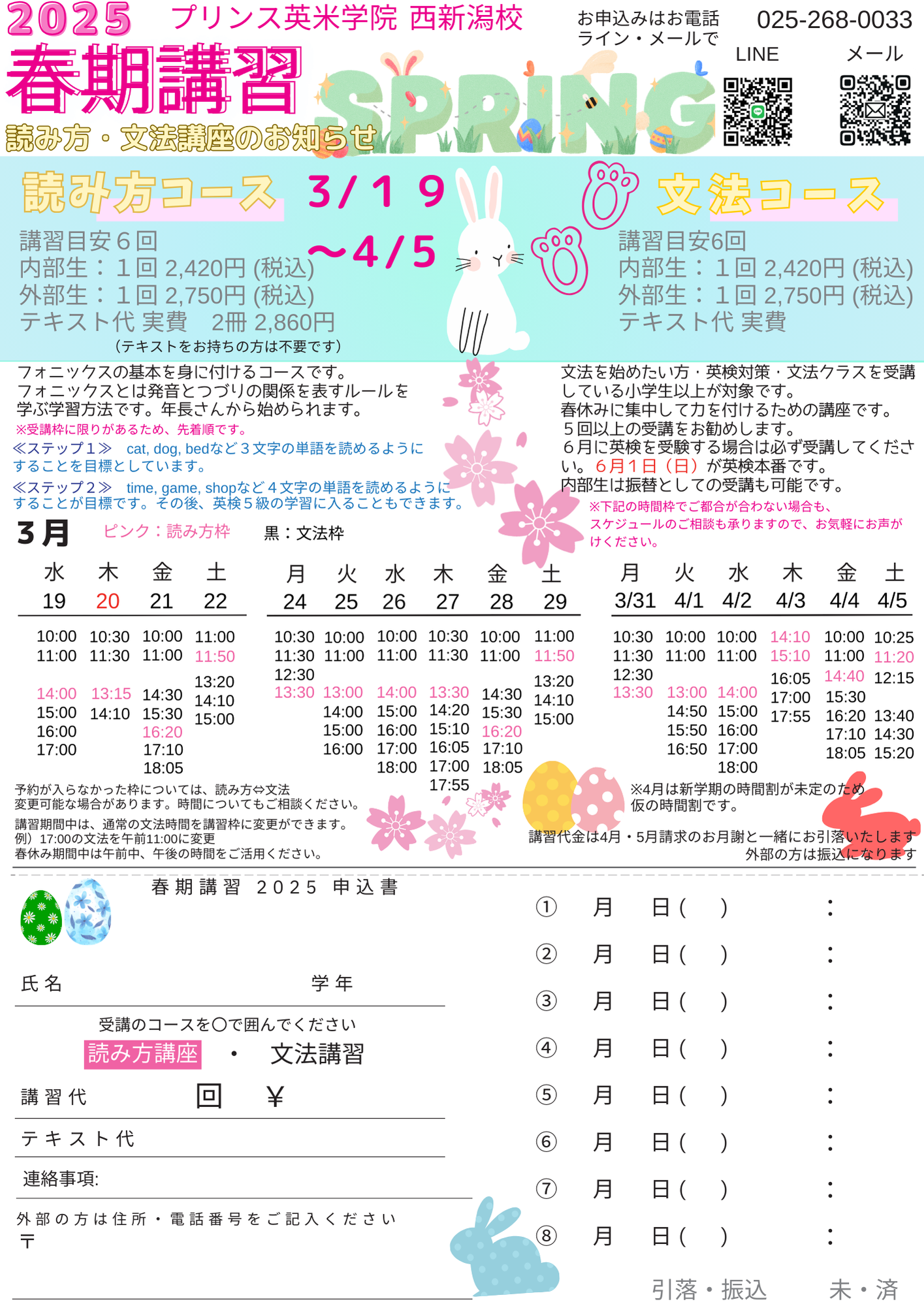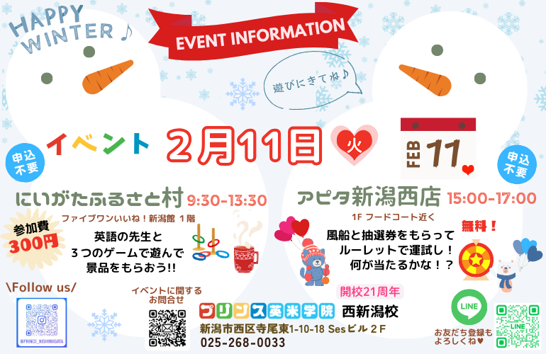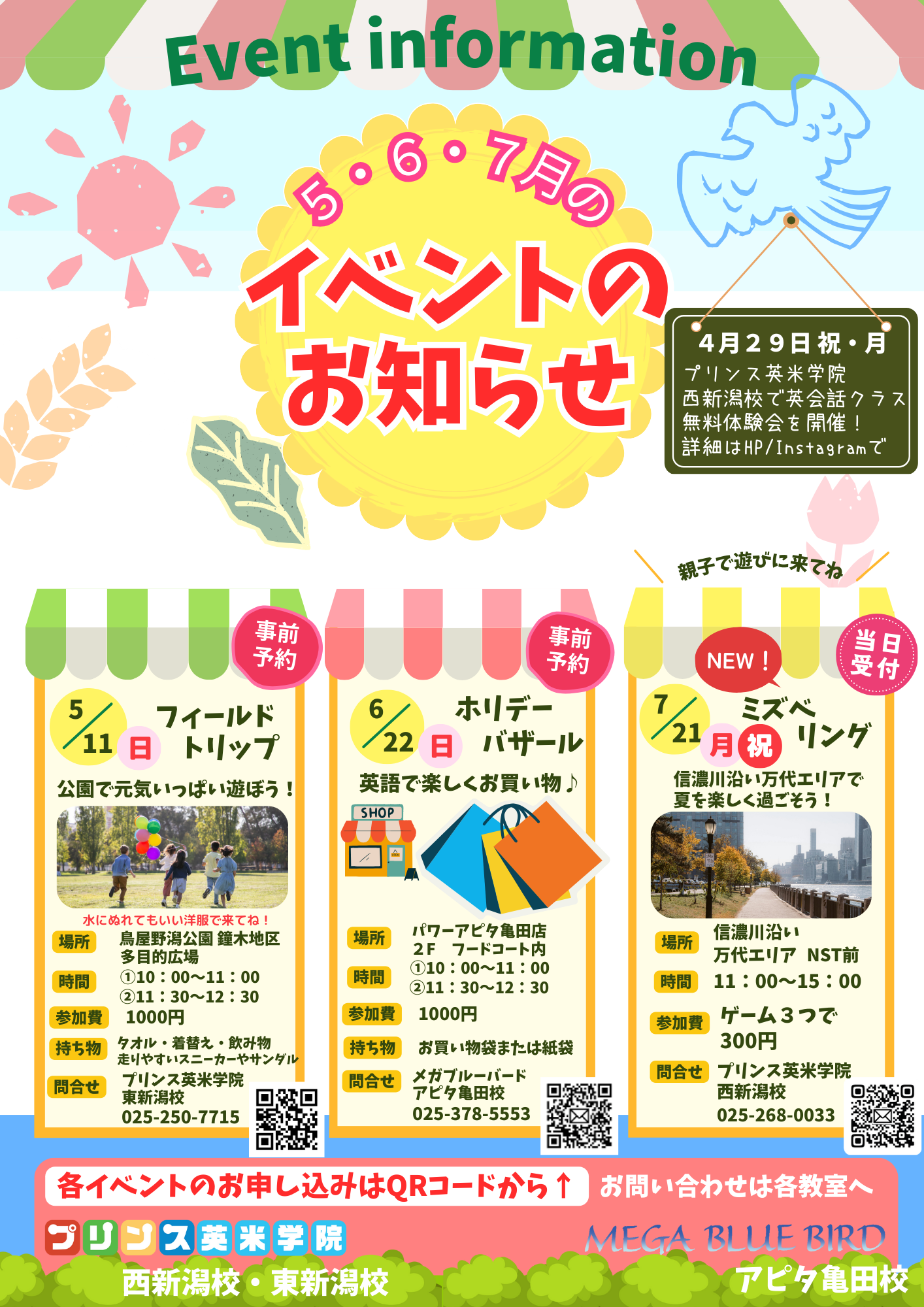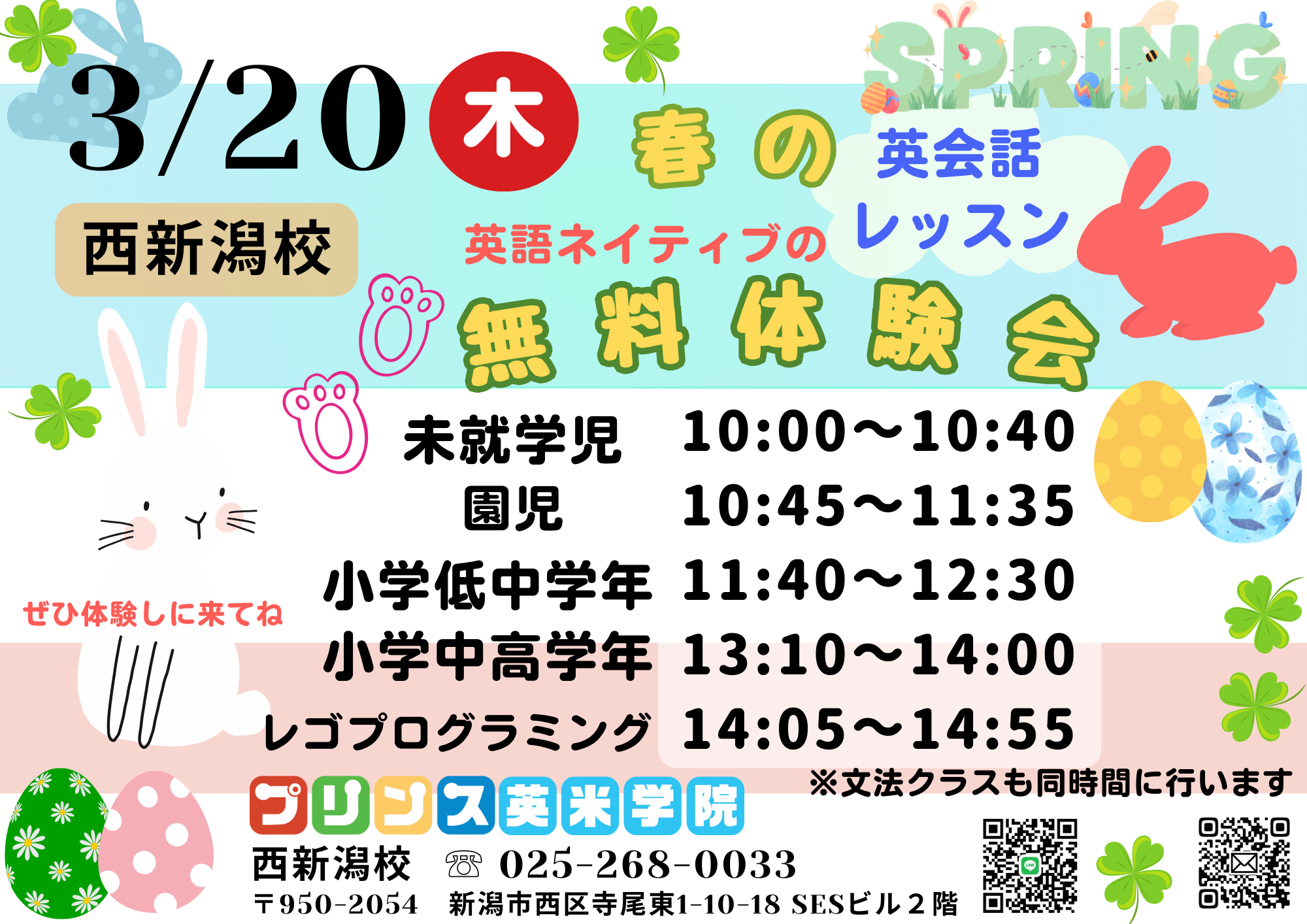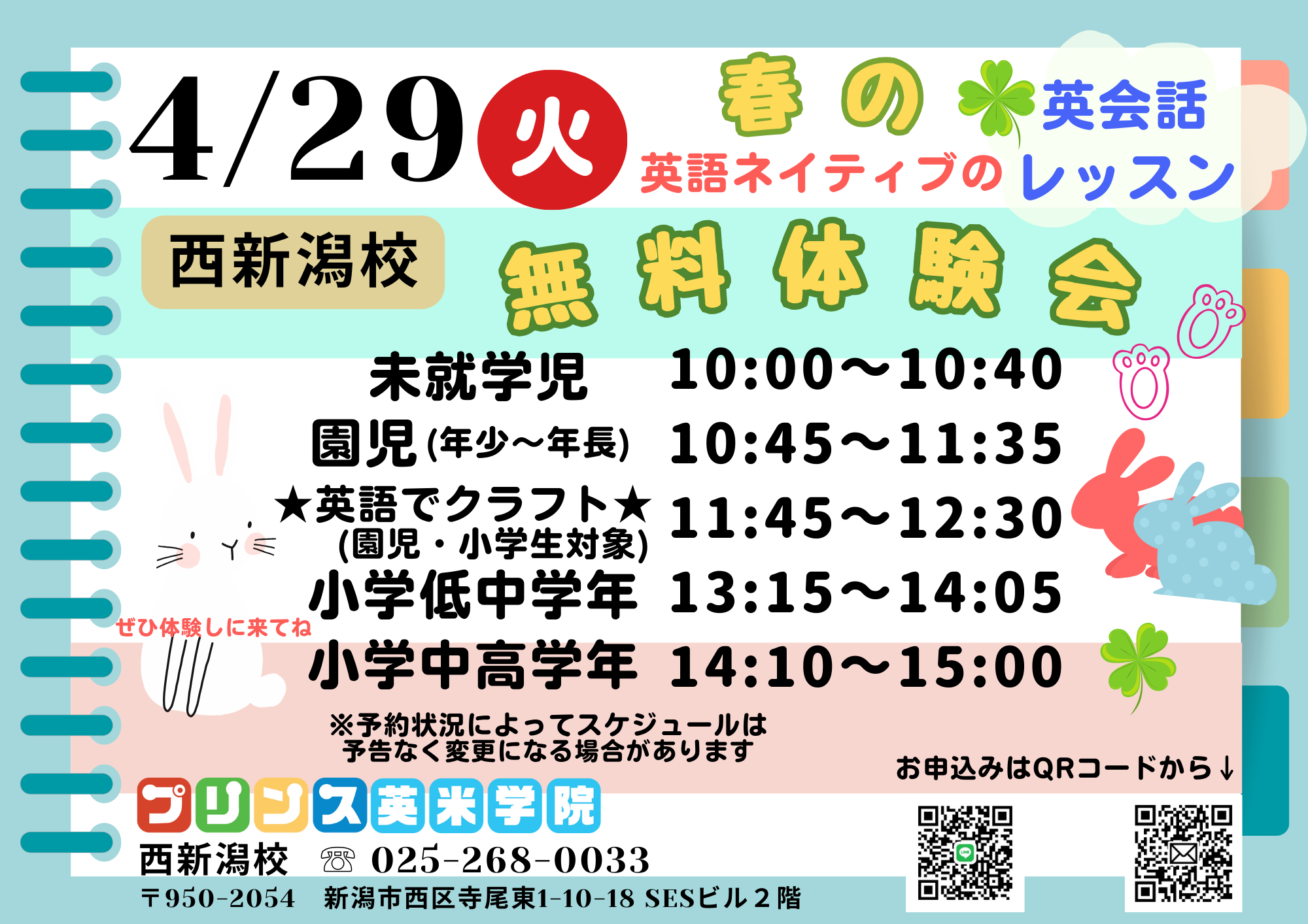 春のキャンペーン🌸実施中4月の1ヶ月間‼️随時体験レッスンも受付中💁‍♀️体験会のご都合が合わない方もお気軽にお問い合わせください。4月29日㊗️火曜日は西新潟校で無料体験会を開催します☘️【プリンス英 ...