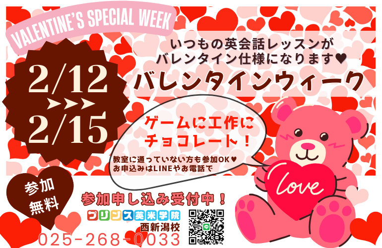 バレンタインウィークがやってくる💝2月12日(水)〜15日(土)の1週間💗バレンタインゲーム、工作✂️、チョコ🍫もゲット🙌チョコが嫌いな人には他のスイーツをご用意🍬みんなで楽しめます💖教室に通っていない方 ...