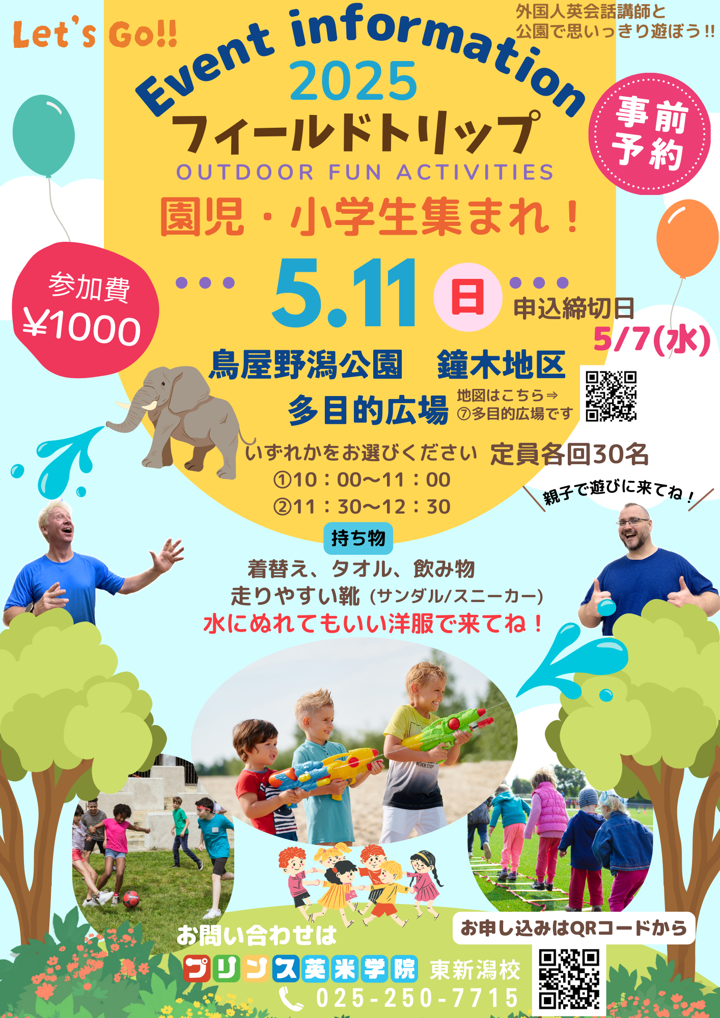 イベントのご案内‼️5月11日日曜日 フィールドトリップ申込受付中💁‍♀️ 申込〆切日 5/7(水)①10:00~11:00②11:30~12:30いずれかの回をお選びください。外でたくさん体を動かして遊ぼう!! ...