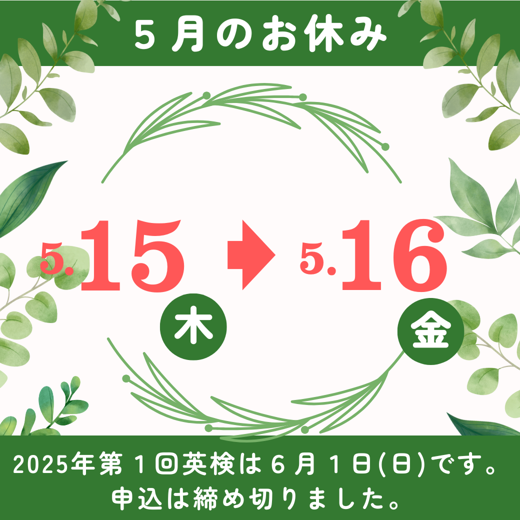 暑い日が続きますね☀💦7月3日(木)、7月15日(火)は教室がお休みです。これから夏本番!イベントが盛りだくさんです☺サマースプラッシュ・夏期講習のご案内をリリースしました!申込受付中です♪ ...