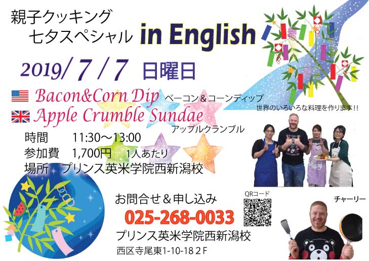 日にち 7月7日 日曜日時間 11:30~13:00場所 プリンス英米学院西新潟校参加費 1,700円(大人)700円(子ども)お料理メニューBacon&Corn Dipベーコン&コーン ディップデザート・メニューApple Cr ...