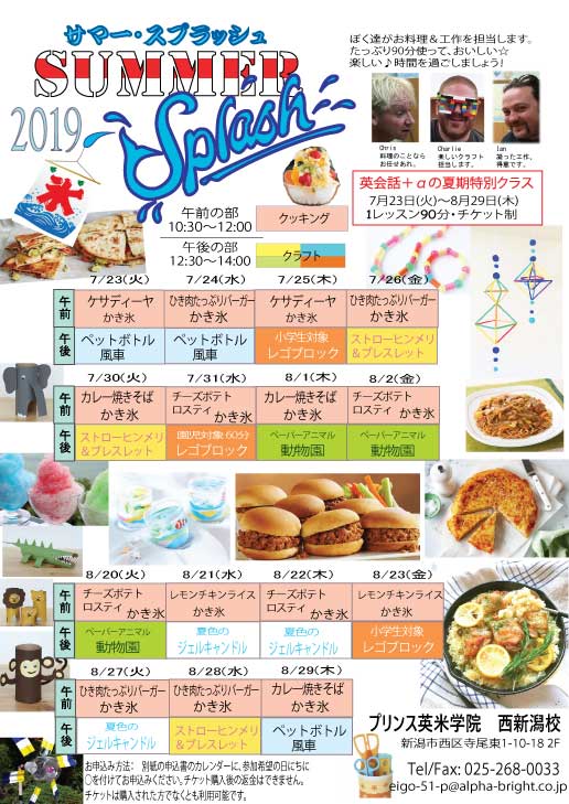 ~SUMMER SPLASH 2019~サマースプラッシュ2019開催します今年も夏休み中の特別レッスン、英語でお料理・英語で工作の楽しい時間です。工作は夏の自由研究の作品としてお料理もお友だちとみんなで ...