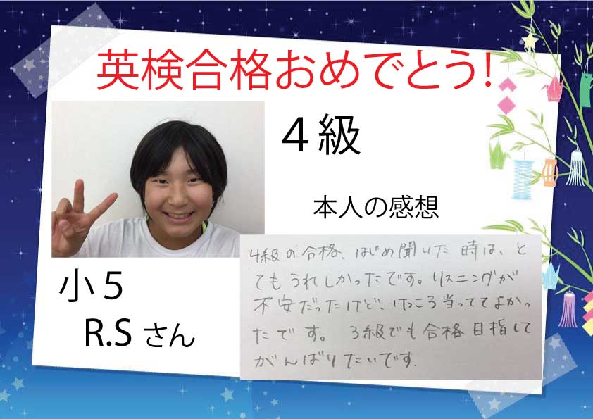 2019年度第1回 英検合格者をご紹介します4級合格者のみなさんです。次の級を目指してがんばりたい!と意気込みを書いてくれました。しっかり復習して次の級に向けて頑張っていきましょう ...