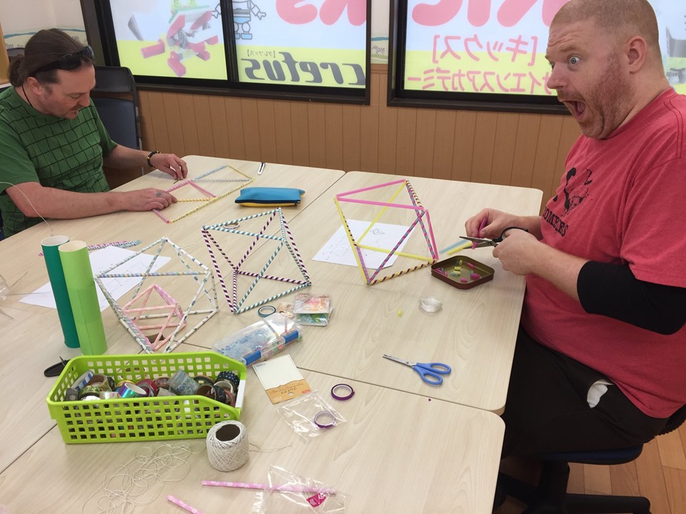 ~サマースプラッシュ準備中 その3~ストローヒンメリのサンプルづくりをしていますダイヤモンド型=正八面体をつくるのですが、三角形を5つ作ってから立体にしていきます。ちょっと頭を使います 図形の勉強にも ...