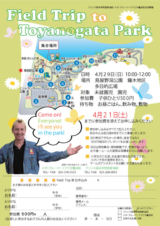 フィールドトリップ開催します 日にち 4月29日 日曜日時間 10:00~12:00場所 鳥屋野公園 鐘木地区 多目的広場 参加費 1人 500円 対象 未就園児・園児さん、小学生もOK (必ず保護者の方同 ...