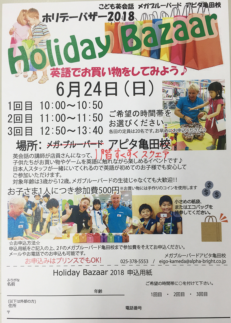 英語でShoppingホリデーバザー開催します場所:アピタ亀田 1階すくすくスクエア日時: 6月24日(日)①1回目 10:00-10:50 空きあり!②2回目 11:00-11:50 もうすぐ定員です③3回目 12:50-13:40 空きあり!参 ...