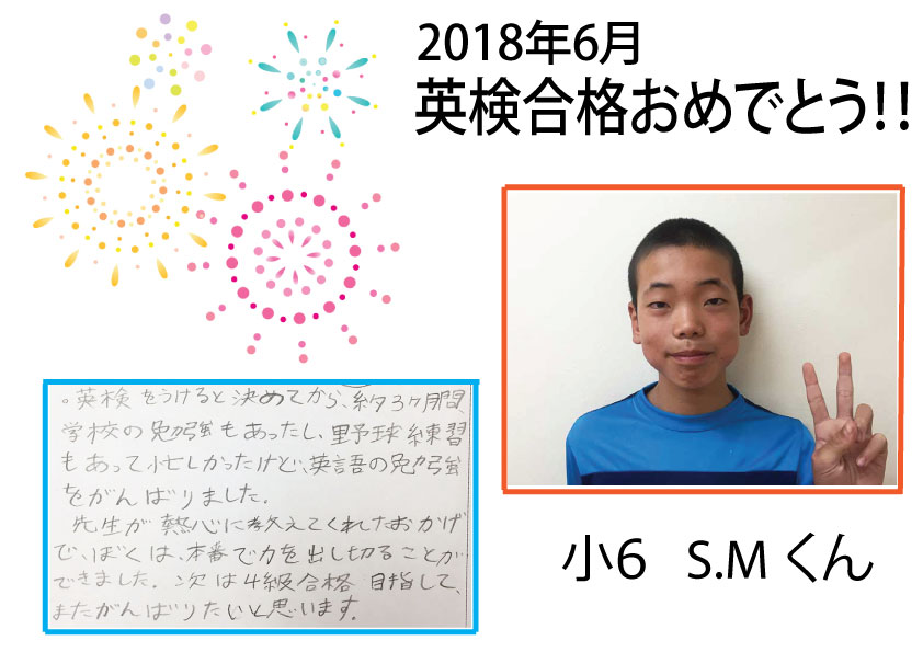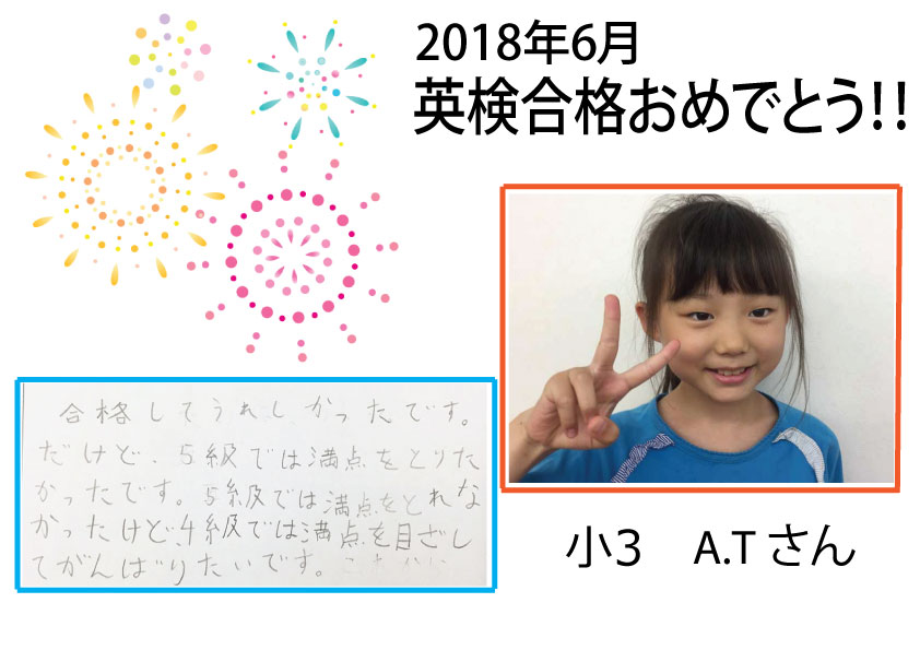 2018年6月受験者、5級~4級合格者の発表です。短期間でがんばって合格を勝ち取った生徒もいます。5級でも本番で満点を取るのが難しい中で、筆記が満点、または、リスニングが満点だった生徒もいます。合格で自信をつ ...