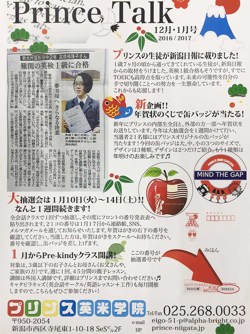本日12月14日水曜日の新潟日報朝刊に 英検1級に合格した高橋侑珠子さんの記事が掲載されました。 こちらの画像でご覧いただけます。 2~3歳の頃には、現在完了も受け身までスラスラと会話ができるようになってい ...