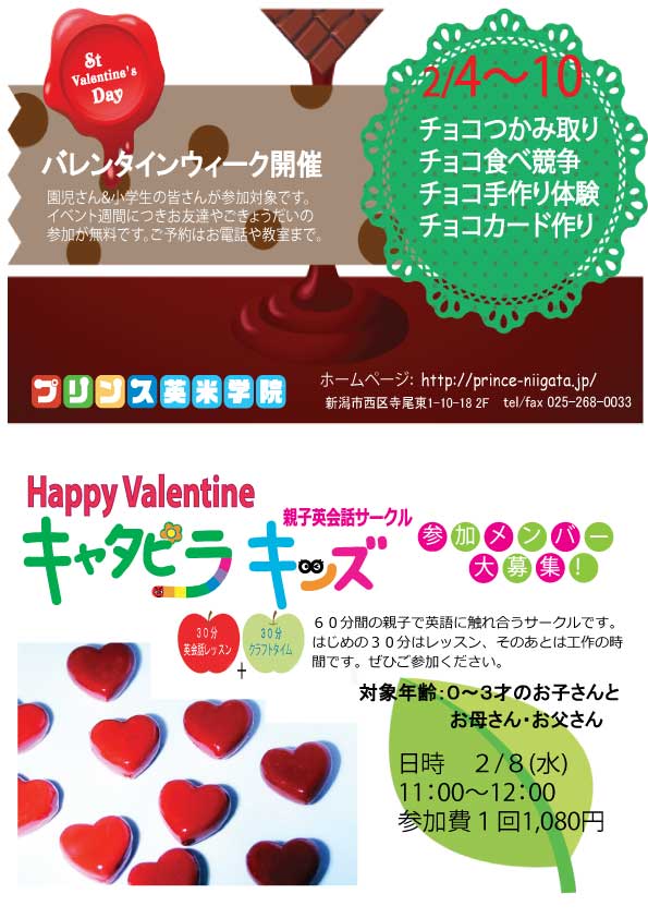 HAPPY Valentine バレンタインウィーク開催します 2/4(土)~2/10(金) はプリンスのバレンタインウィークです。 バレンタインにちなんだ楽しいゲームを企画中です。 園児さん、小学生の、お友達やご兄弟、 そして教 ...