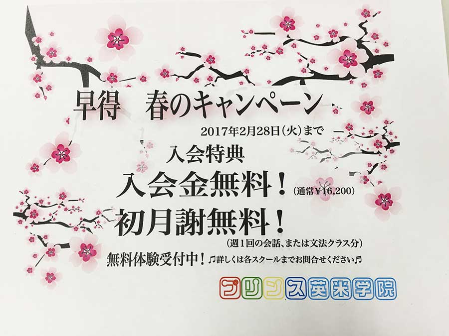 プリンス英米学院に、2月28日(火)までにご入会いただいた方には、嬉しい入会特典があります。入会金¥0 (通常¥16,200)初月謝¥0 (週1回の会話クラス、または文法クラス分)無料体験レッスンも好評受付 ...
