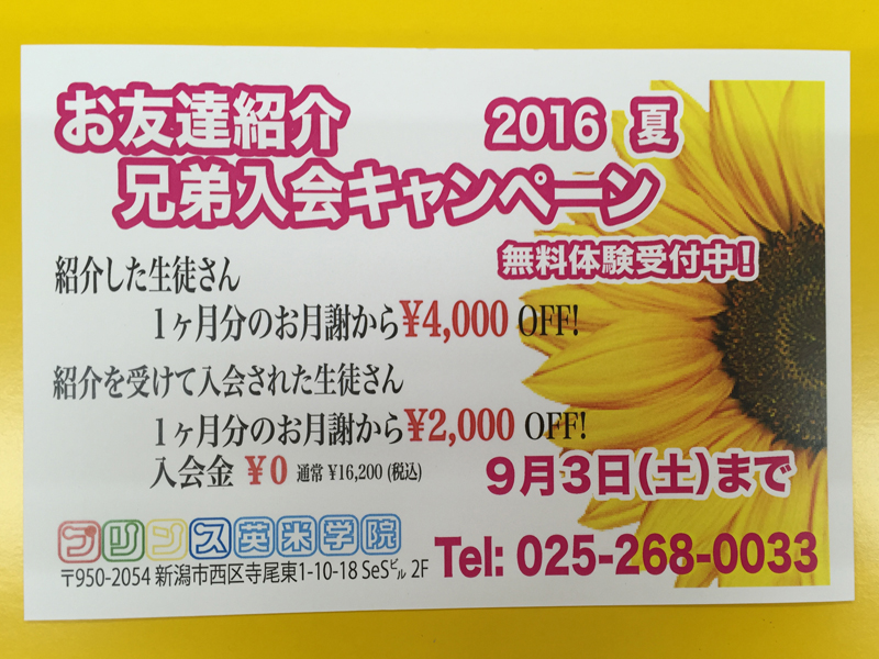 お友達紹介&兄弟入会キャンペーン実施中! 紹介した生徒さんは、 1か月分のお月謝から4000円OFF!! 紹介を受けて入会された生徒さんは、 1か月分のお月謝から 2000円OFF!! さらに! ...