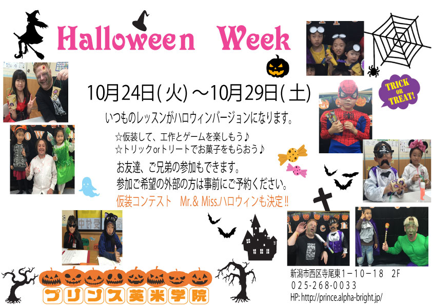 プリンス ハロウィンウィーク開催!!10月25日(火)~10月29日(土) 通常レッスンがハロウィンバージョンになります。ハロウィンの工作とゲームをします。スタッフ投票 仮装コンテストあり! Mr. & Miss ...