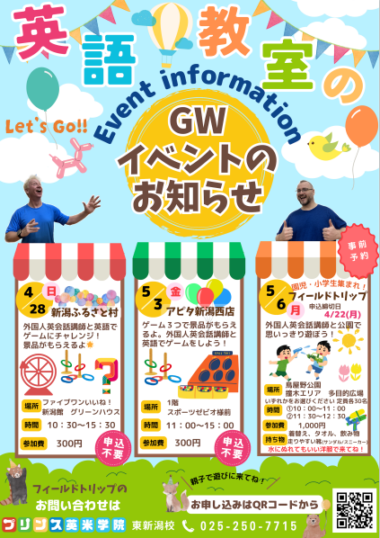 早くも4月半ばとなりましたが、みなさま新年度には慣れてきましたか?新潟市内は気温も一気に上がり、桜も見ごろですね🌸 暖かくて天気が良い日はやっぱり外遊びでしょう!!ということで、今年もField Trip開催のお ...