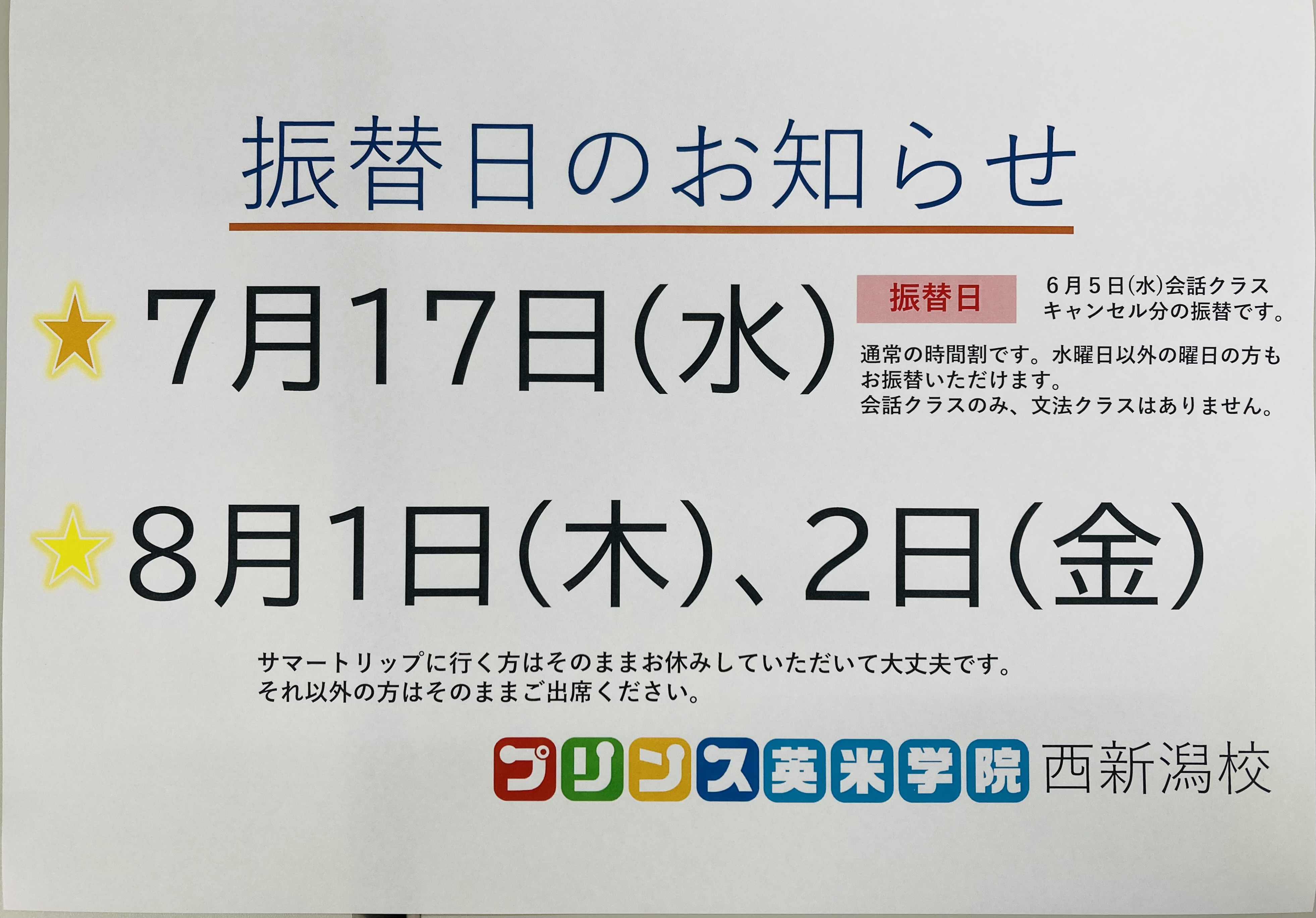 振替日のお知らせ●7月17日水曜日ご予約の方の会話クラスのみオープンします。文法クラスはありません。●8月1日(木)、2日(金)木曜日、金曜日に通われている方は通常通りお越しください。サマートリップに ...