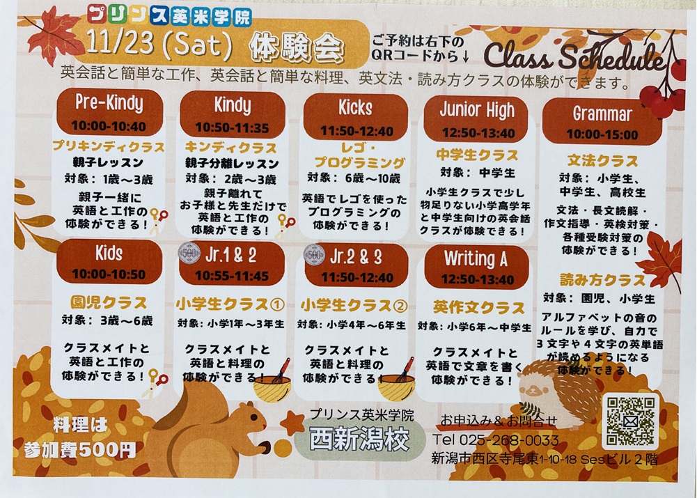 習い事の秋🍁🍁英語を始めませんか😃🔤11月23日㊗️土曜日 体験会を開催します🍠ただ今ご予約受付中です💁‍♀️時間割はご案内をご覧ください♪内部生も振替予約を受付中です💁‍♀️時間割が通常と異な ...